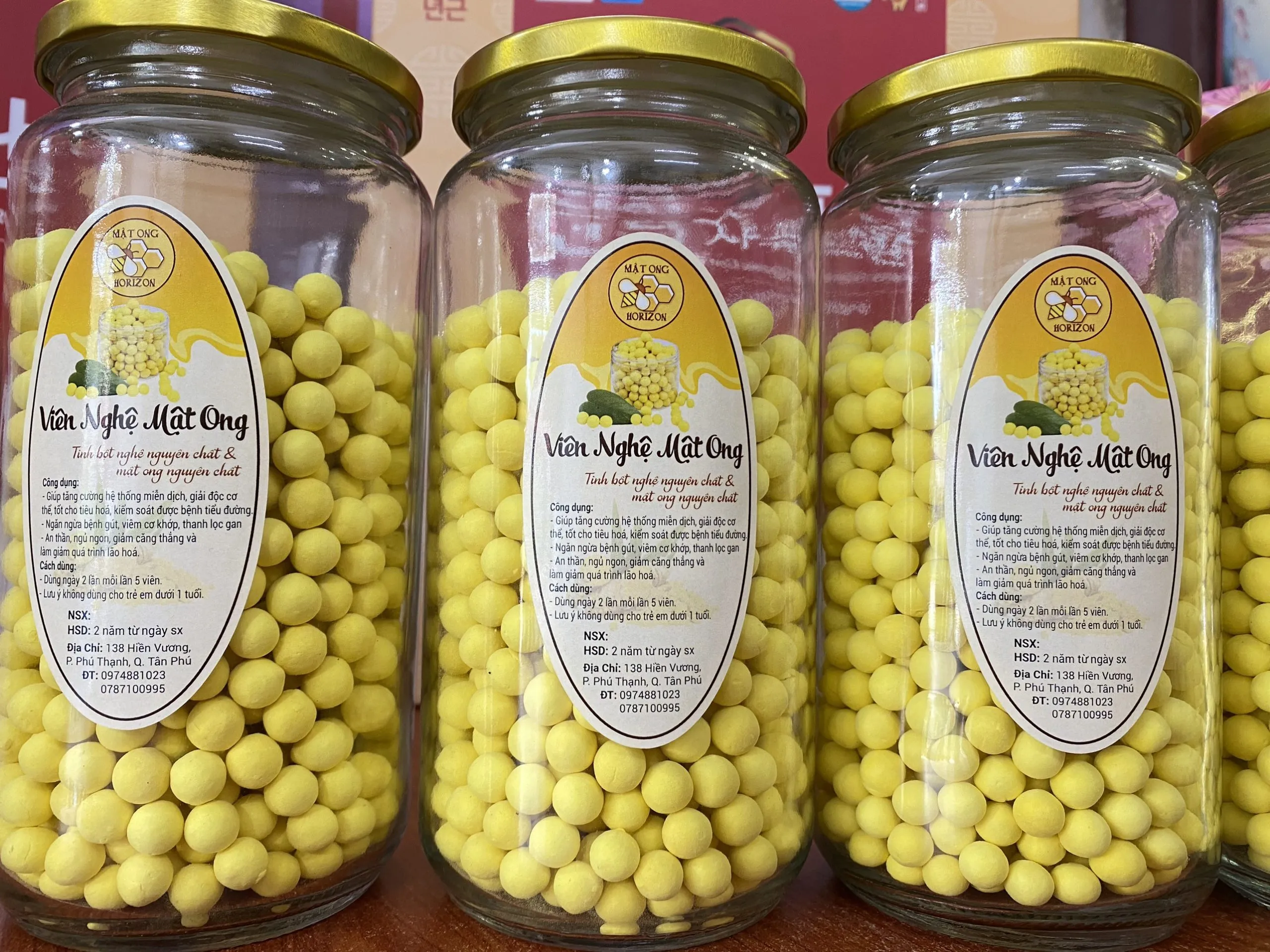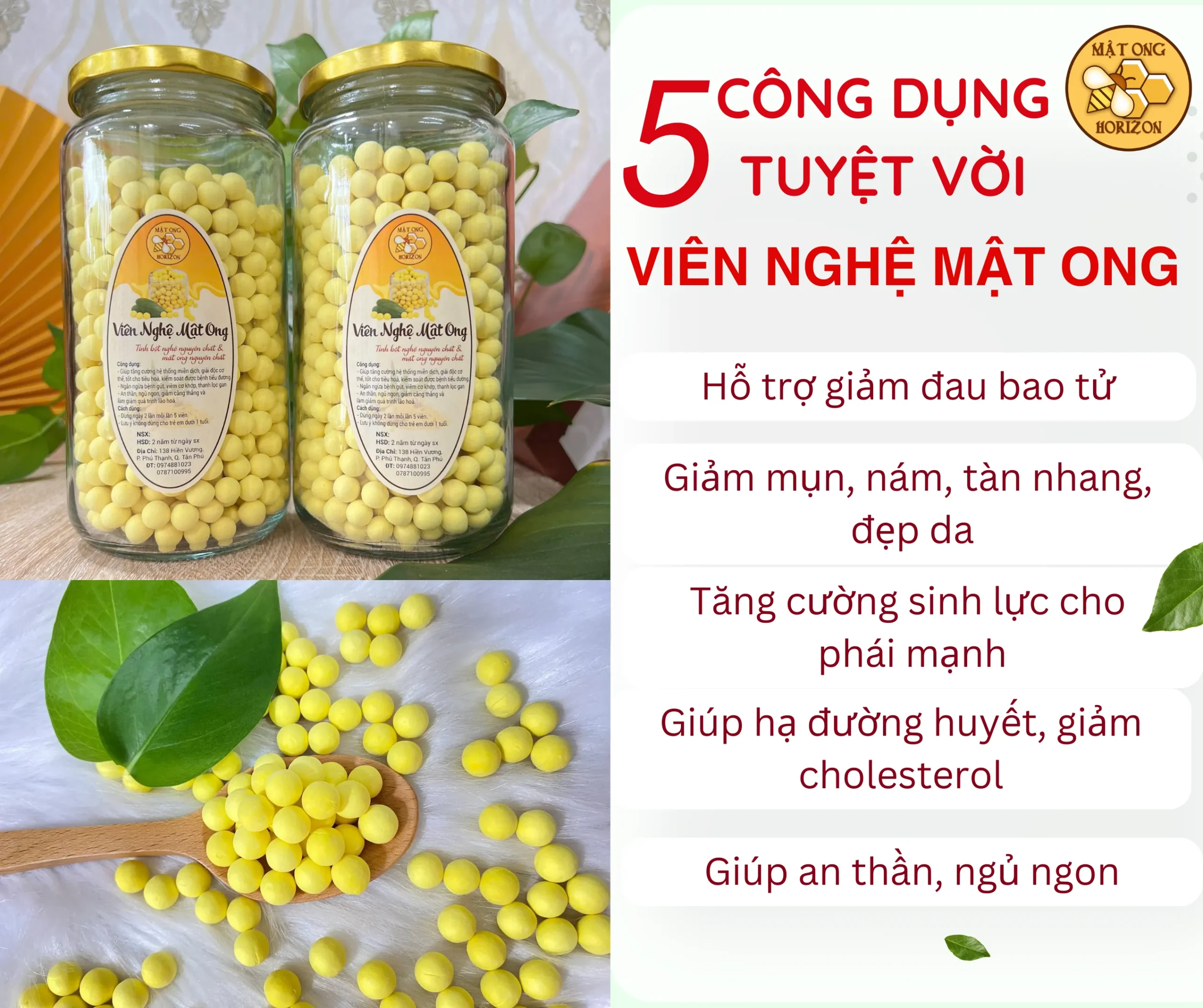 • Viên nghệ mật ong giúp bổ sung dinh dưỡng, tăng cường sức đề kháng, hỗ trợ điều trị bệnh dạ dày, cải thiện làn da, ngăn ngừa tình trạng lão hóa. Đặc biệt, sản phẩm làm giảm cholesterol xấu để bảo vệ sức khỏe tim mạch.